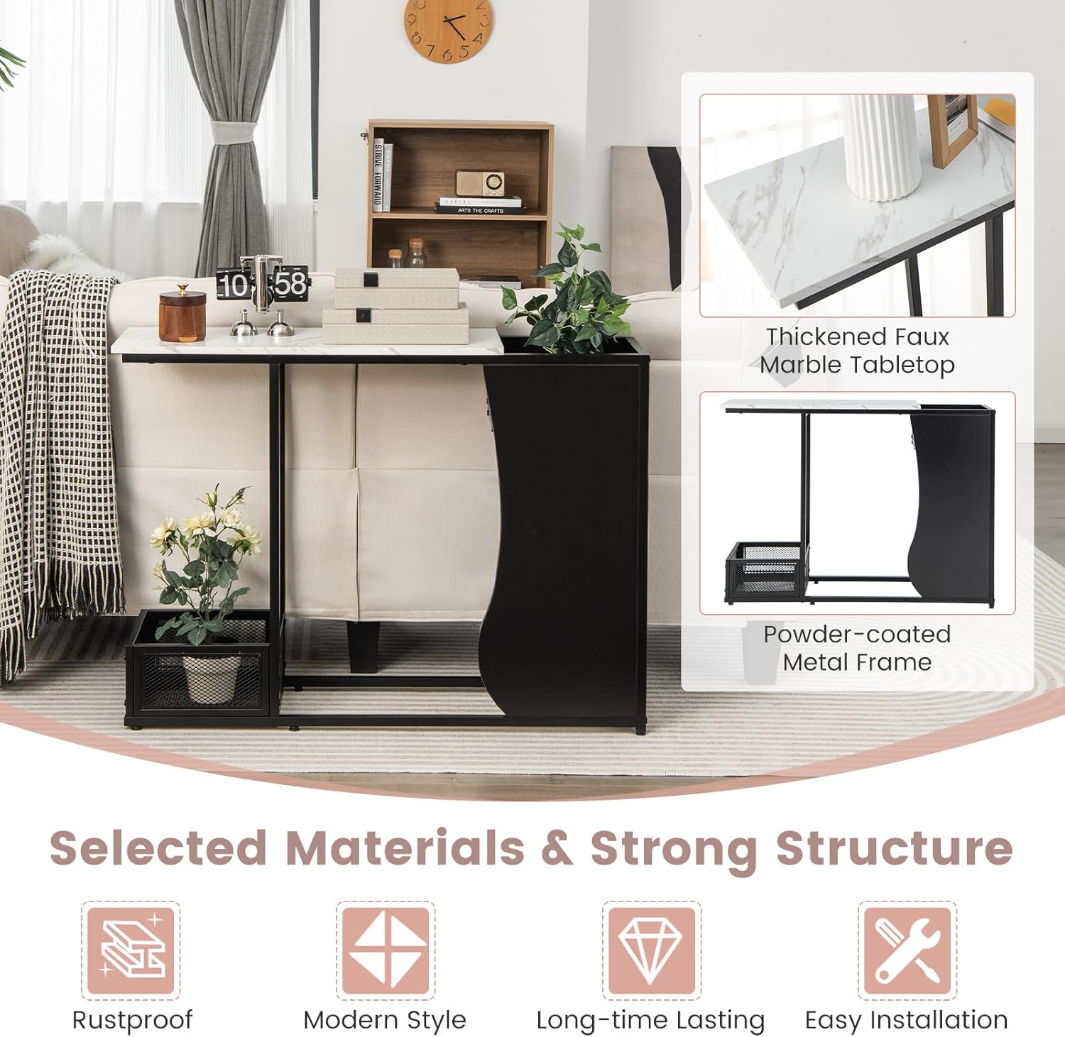 Description:This stylish and elegant side table will definitely beautify any indoor setting. Its clear lines and faux marble top give an elegant look, while the black metal frame adds a touch of sophisticated style. The spacious tabletop is perfect for displaying photo frames, models or decorative items. In addition, two storage baskets allow you to display your favorite potted plants or decorative vases. This entryway table is made of high-quality MDF and metal to ensure long-lasting stability. Moreover, the smooth and waterproof table top makes cleaning and maintenance a breeze. For extra safety, it is equipped with anti-toppling devices and adjustable legs. You can use it as an entryway table, a sofa-side table, display table, or place it on your balcony as a plant stand. Our modern style console offers endless possibilities.Features:Enhance the indoor setting with our stylish entryway tablespacious tabletop provides ample space for displaying photo frames, models or decorative items2 storage compartments allow you to display your favorite potted plants or other decorationsPowder coated metal frame ensures the table is structurally stable and long-time lastingAdjustable foot pads protect the floor and keep the side table balancedTable with anti-toppling devices for extra stabilityCan be used as a console table, entryway table or sofa side table, etc.Easy to assemble with detailed instructionSpecifications:Color: White, BlackMaterial: MDF, MetalOverall Dimension: 43.5” x 12” x 31.5” (L x W x H)Width of Desktop: 31.5”Dimension of Each Cube: 11” x 10 “ x 6” (L x W x H)Weight Capacity of Tabletop: 110 lbsNet Weight: 25 lbsPackage Includes:1 x Side Table1 x User Guide