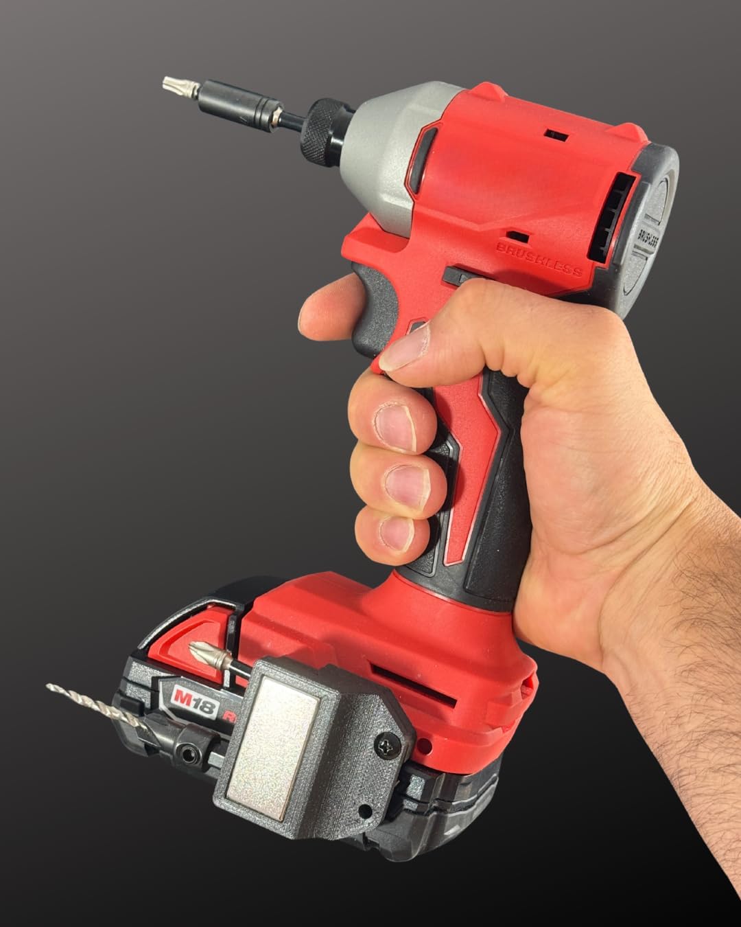 TUFBIT is a patent-pending, high-powered 24lb pulling force magnet, encased in a durable housing infused with carbon fiber, that attaches to any drill equipped with a skyhook mount. Includes both a left and right spacer unit for preferred attachment and drill brand. Securely and safely holds your drill bits and screws in a forward-facing position out of the way of grip. Perfect for contractors, DIYers, and anyone who needs a convenient way to keep metal items handy. Never lose a screw again!