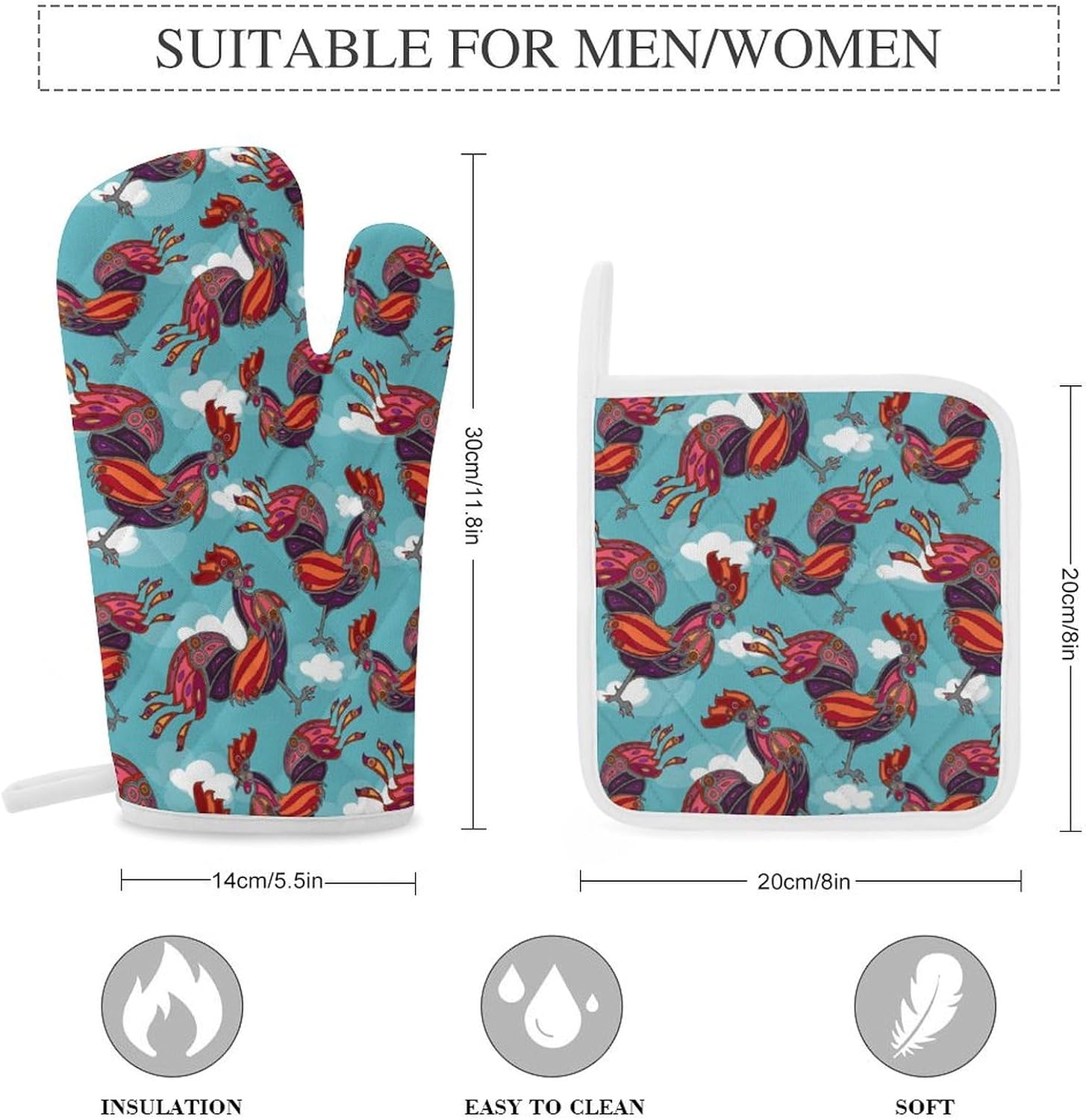 This 3-piece oven mitt and pot holder set is made of washable and reusable fabrics and is suitable for use when cooking and baking in the kitchen such as hot pots, barbecues, and microwave ovens.